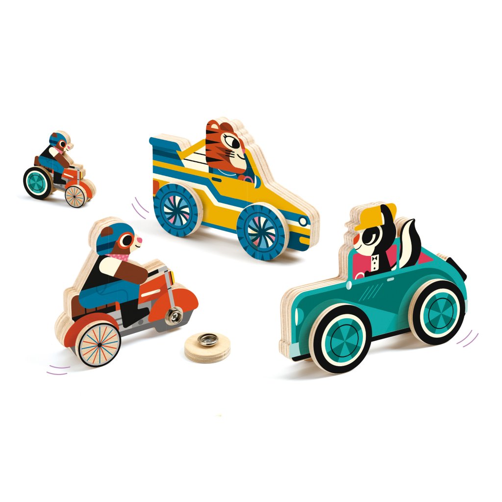 Krásně malované dopravní prostřeky pro závodění. Každé vozidlo má v místě kola malou patentku, aby se dala kola nasazovat a vyrazit na závodění. Pro děti od 3 let. Rozměry balení: 22,6 x 22,6 x 4cm.