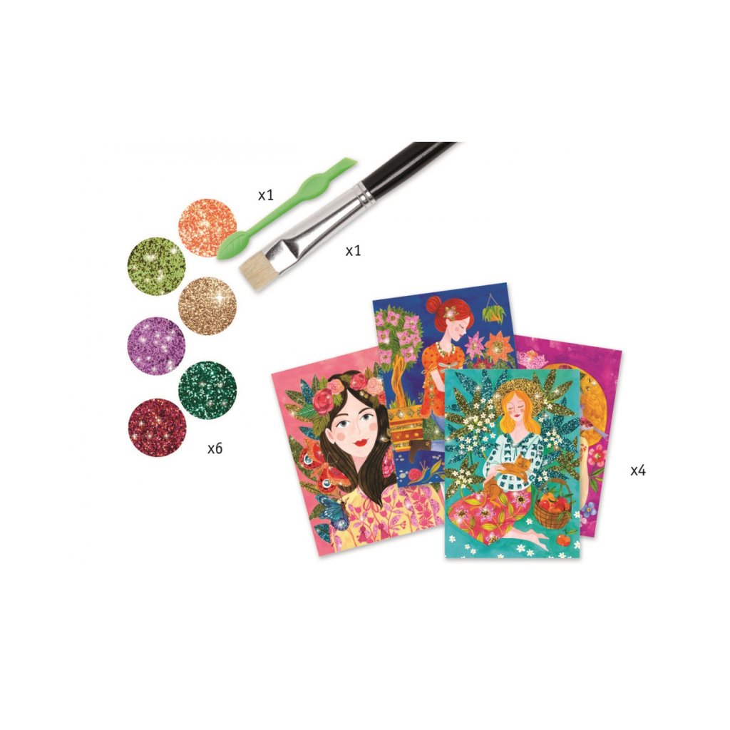 Krásné květinové dívky k dotvoření pomocí třpytivých písků. Sada obsahuje 4 lepivé podložky s obrázky, 6 tub se třyptkami, 1 pomůcka na odstranění papíru z lepivé části obrázku, 1 štětec a návod na přesný postup. Vhodné pro děti od 7 let. Rozměry balení: 16,5 x 23 x 4 cm.