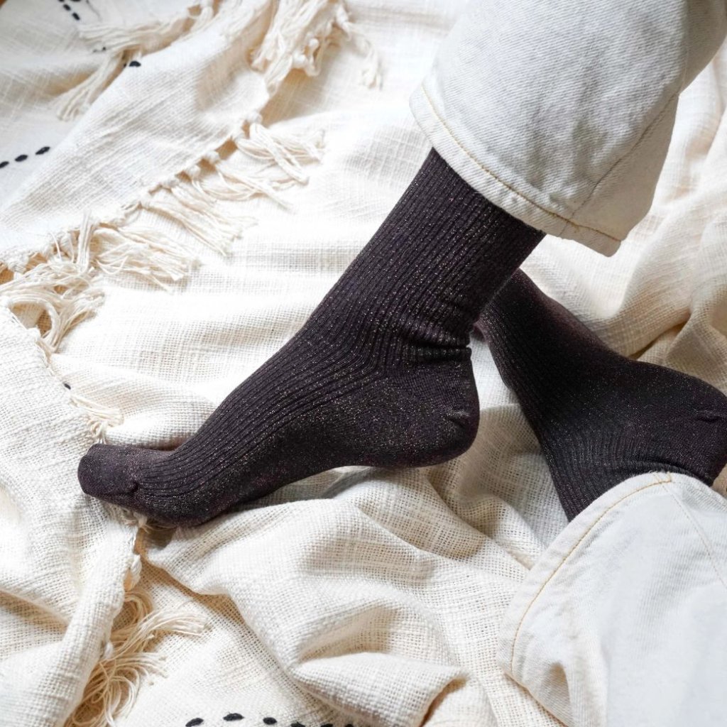 Elegantné lurexové ponožky v bohatej farbe Chocolate Dark Brown, ktoré dodajú vášmu štýlu hrejivú sofistikovanosť. Vyrobené z ekologickej bambusovej lyocellovej priadze – mäkké, ľahké a odolné, pre radosť z každého kroku.
