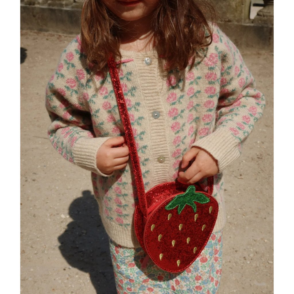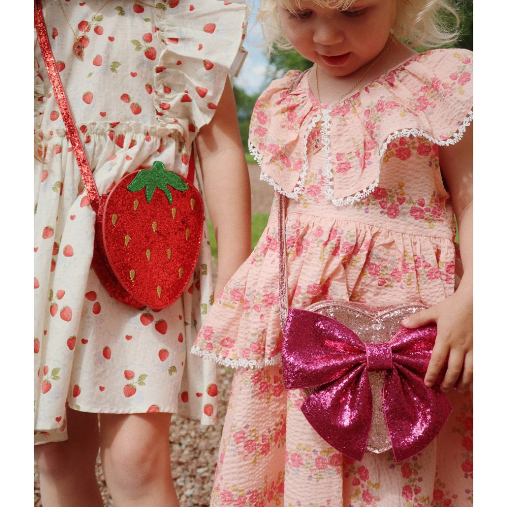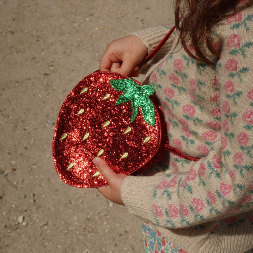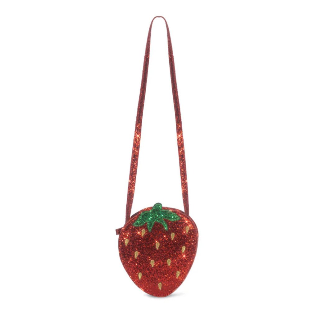 Kabelka na rameno v tvare jahody, zdobená trblietkami a s úzkym ramenným popruhom.