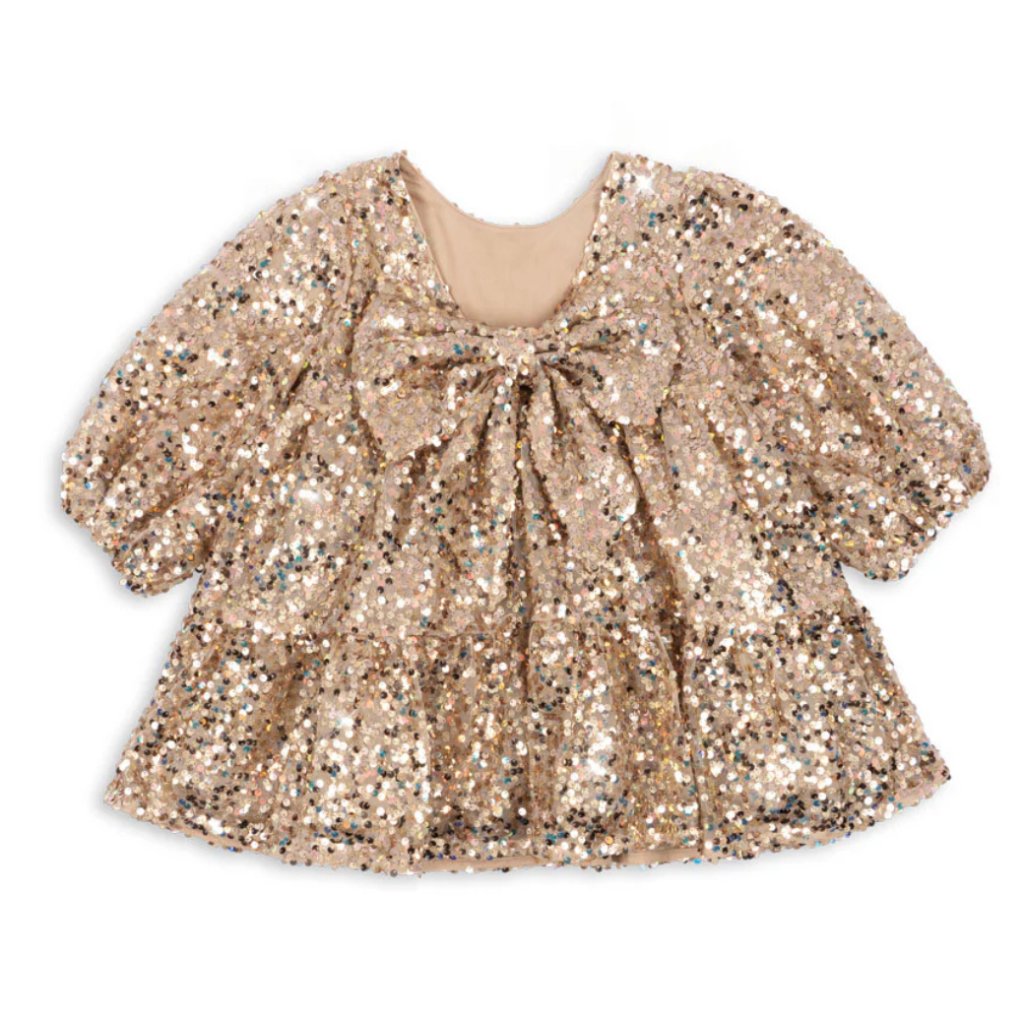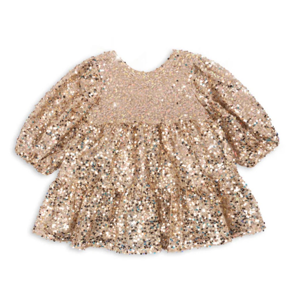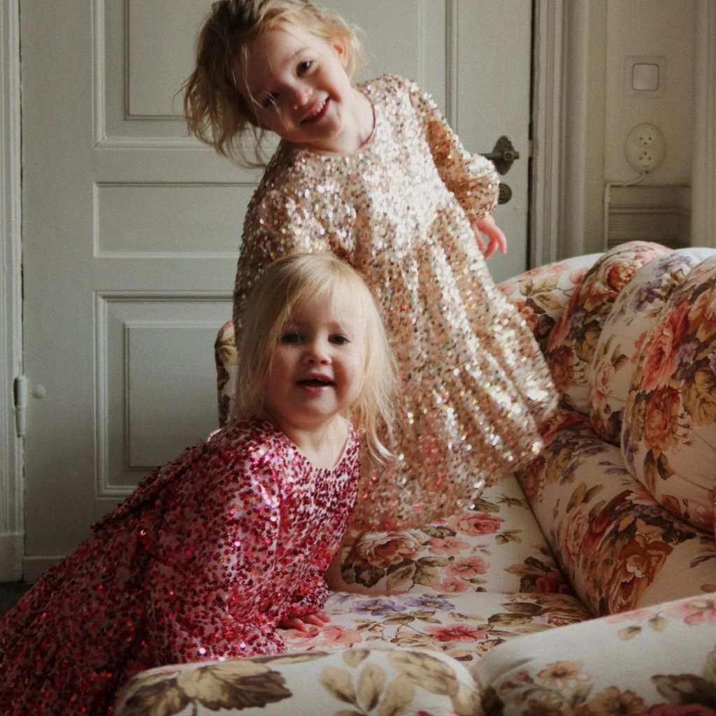 Skutočný klenot medzi šatami – model Lila je celý pokrytý trblietavými flitrami, má ozdobné balónové rukávy a rozšírenú sukňu s mäkkou bavlnenou podšívkou.