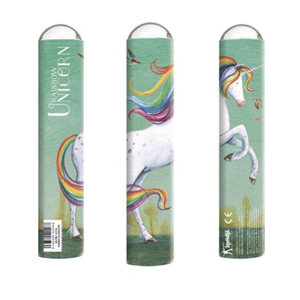 Tento krásně ilustrovaný kaleidoskop s motivem jednorožce promění skutečný svět kolem vás v kaleidoskopické obrazce plné barev a tvarů. Stačí přiložit oko k malé kopuli – a fantazie se rozběhne naplno.