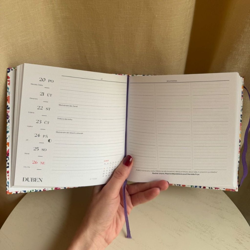 Uvnitř nájdete všetko, čo vám pomôže mať rok pod kontrolou a zároveň v harmónii: školské stránky pre rozvrhy a krúžky vašich detí, priestor na plánovanie darčekov i obľúbené inšpiratívne citáty, ktoré vás povzbudia a potešia na každej stránke. Nechýba ani praktická kapsa a gumička, ktorá spoľahlivo udrží diár zatvorený.