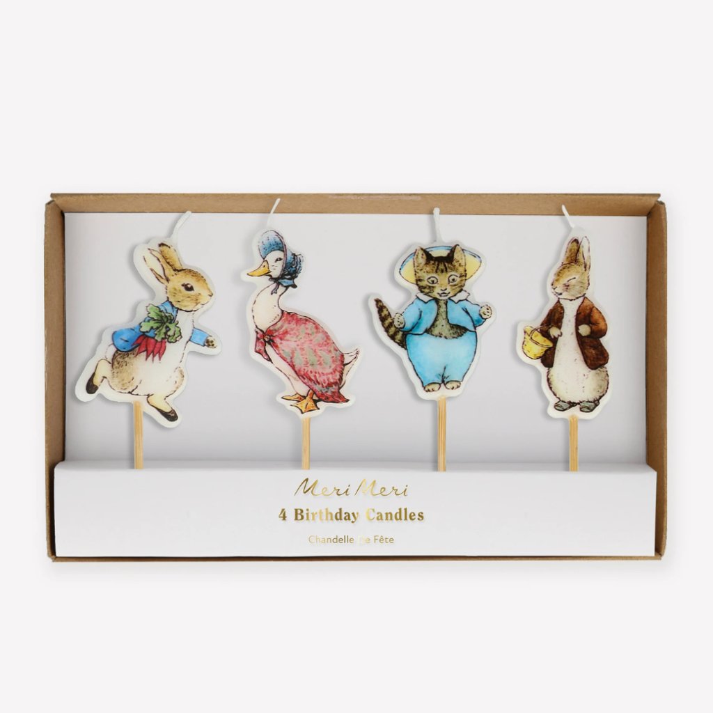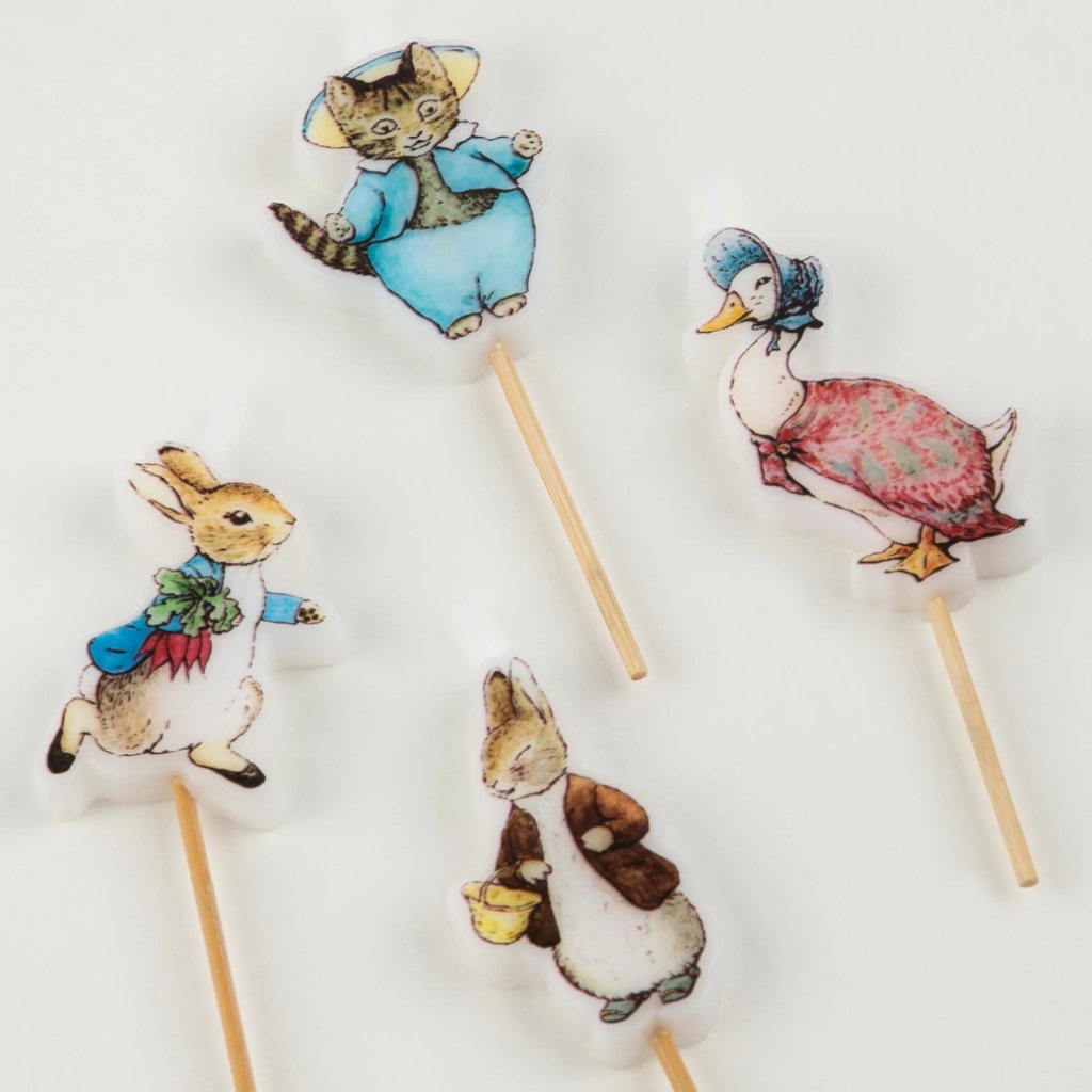 - Sviečky zobrazujú Petra Králika, Jemimu Puddleduck, Toma Kittens a Benjamina Králika