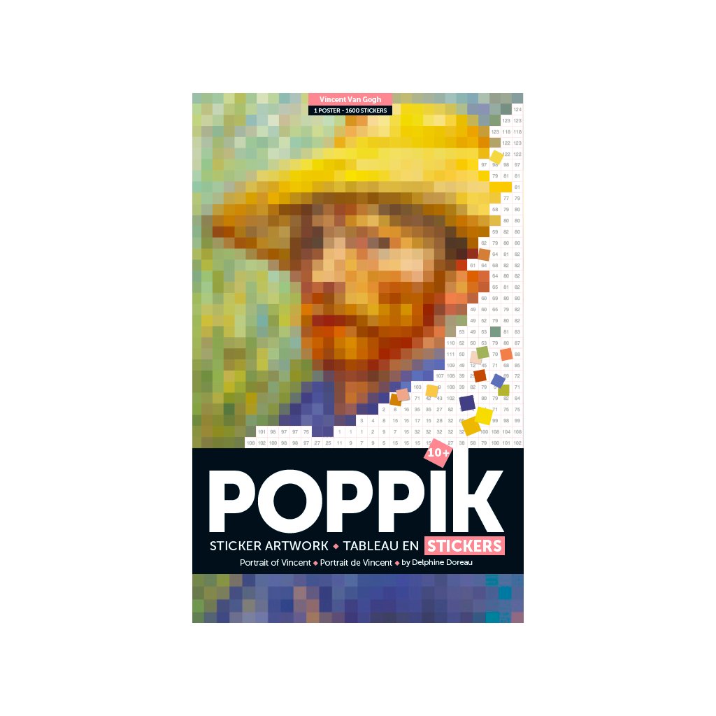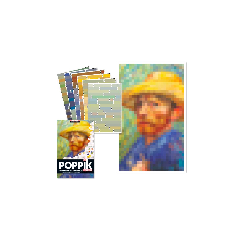 1 plakát (45 x 50 cm) + 1600 samolepek. Nechte se překvapit tímto pohyblivým pixelovým portrétem malíře Vincenta Van Gogha. Je jen na vás, abyste nalepili stovky barevných samolepek na plakát podle čísel. Postupně se objevuje slavný umělec. Tato nenáročná a relaxační aktivita vypadá jako puzzle, mozaika nebo obří samolepka. Po dokončení je možné plakát zarámovat a použít jako dárek nebo dekoraci. Samolepky jsou znovusnímatelné.