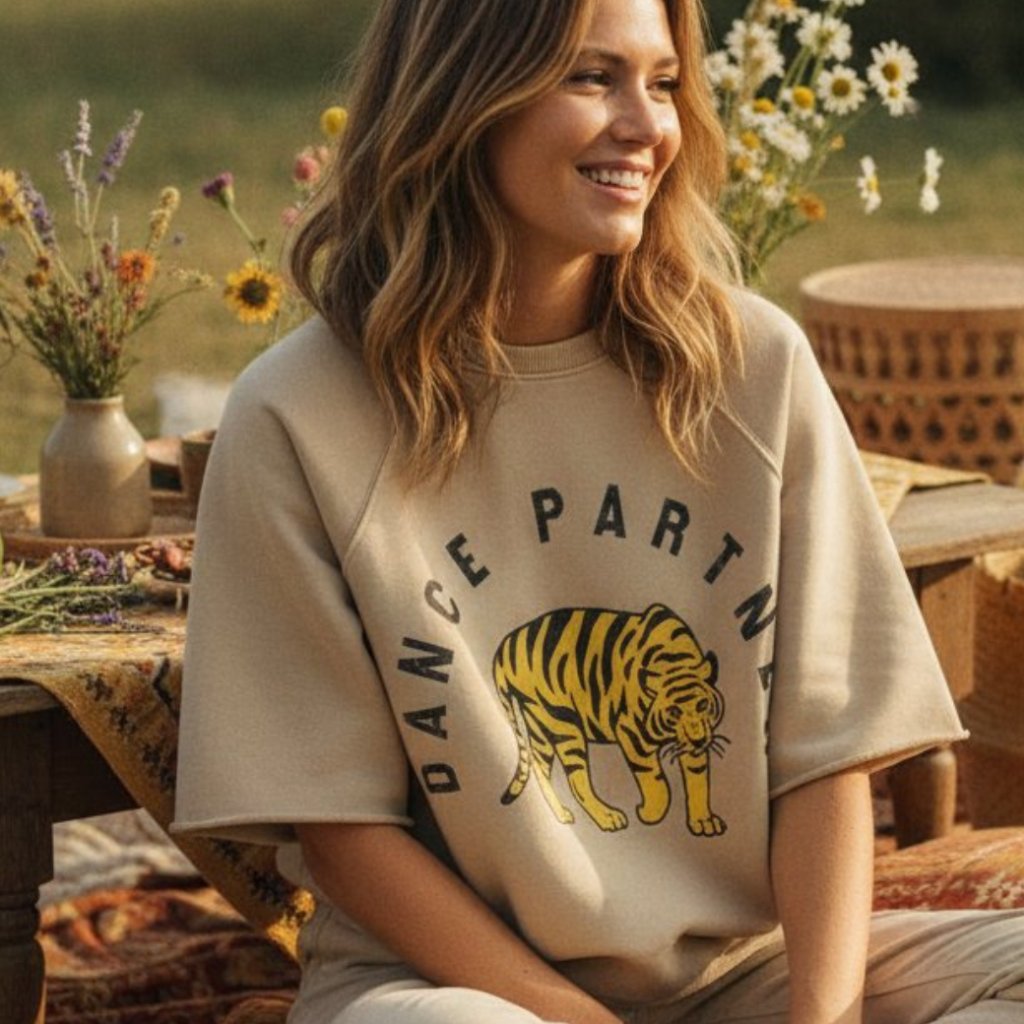 Mikina z organickej bavlnenej fleece tkaniny má krátke rukávy so surovým zakončením, rebrované okraje a potlač na prednej strane. Zadnú časť dopĺňa malé logo, ktoré podčiarkuje charakteristický štýl značky.