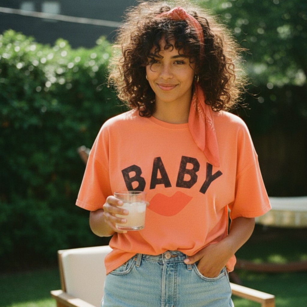 Tričko s okrúhlym výstrihom má krátke rukávy so spadnutými ramenami a potlač na prednej strane. Zadnú časť pri krku dopĺňa malé logo. Zmes bavlny a ľanu zabezpečuje ľahkosť, priedušnosť a pohodlie počas celého dňa.