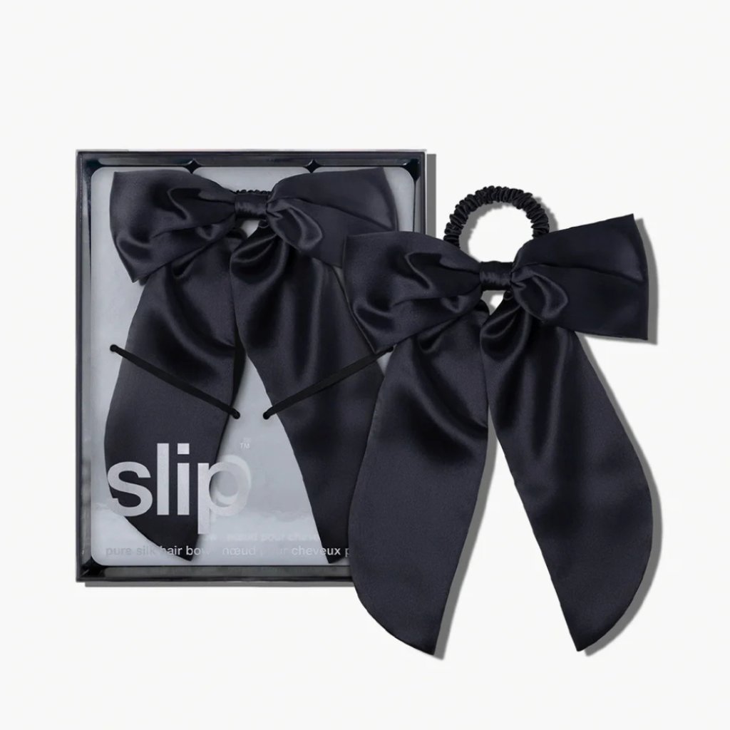 Čierna hodvábna mašľa Slip je navrhnutá tak, aby jednoducho a prirodzene podčiarkla akýkoľvek účes – či ju nosíte v rozpustených vlasoch, cope alebo v zapletených prameňoch.
