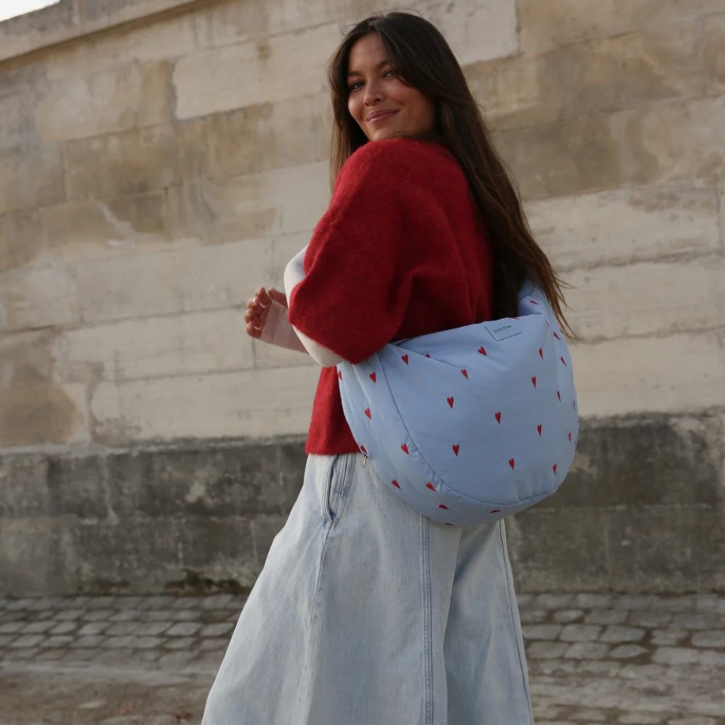 Crossbody taška je vyrobená z mäkkej, polstrované tkaniny s jemnou výšivkou červených srdiečok, ktorá jej dodáva hravý a hrejivý vzhľad. Je ľahká a pohodlná na nosenie, pričom všetky nevyhnutnosti zostávajú bezpečne uložené. Priestranná hlavná priehradka so zapínaním na zips obsahuje vnútornú kapsu na drobnosti a dve praktické bočné kapsy. Dostatočne veľká na fľašu s vodou, knihu, peňaženku aj kľúče, pritom kompaktná pre pohodlné nosenie cez telo.