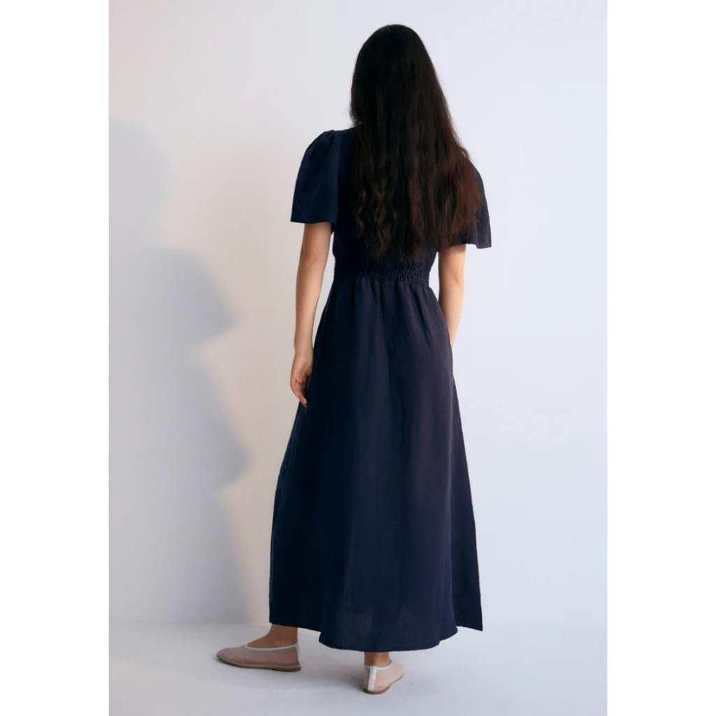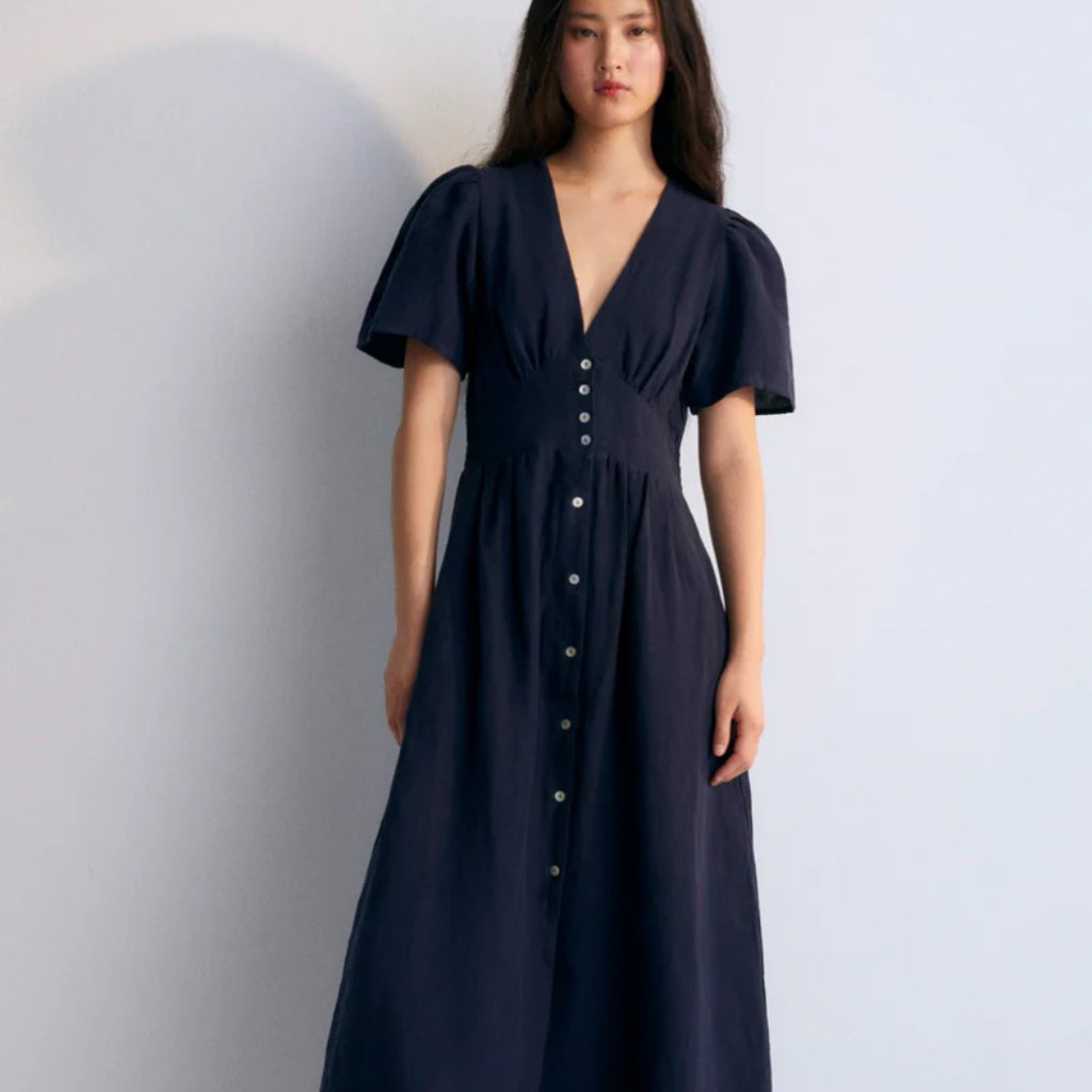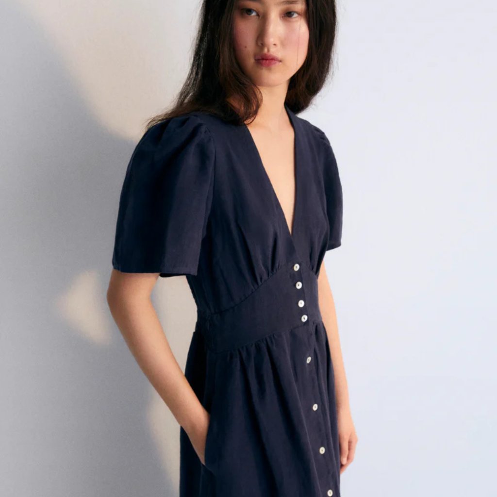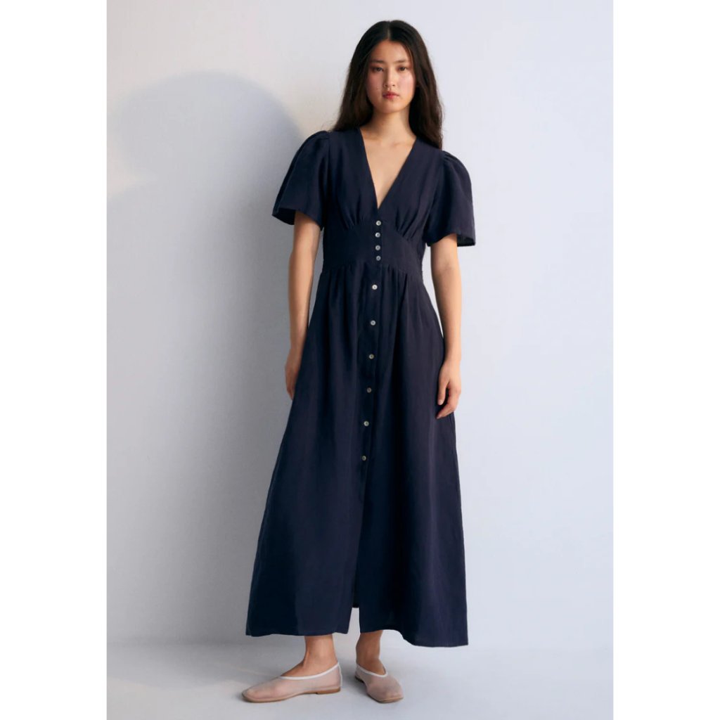 Ľahké a priedušné šaty zo 100 % ľanu s klasickým strihom s výstrihom do V, krátkymi rukávmi s jemným nariasením a gombíkmi na prednej strane.
