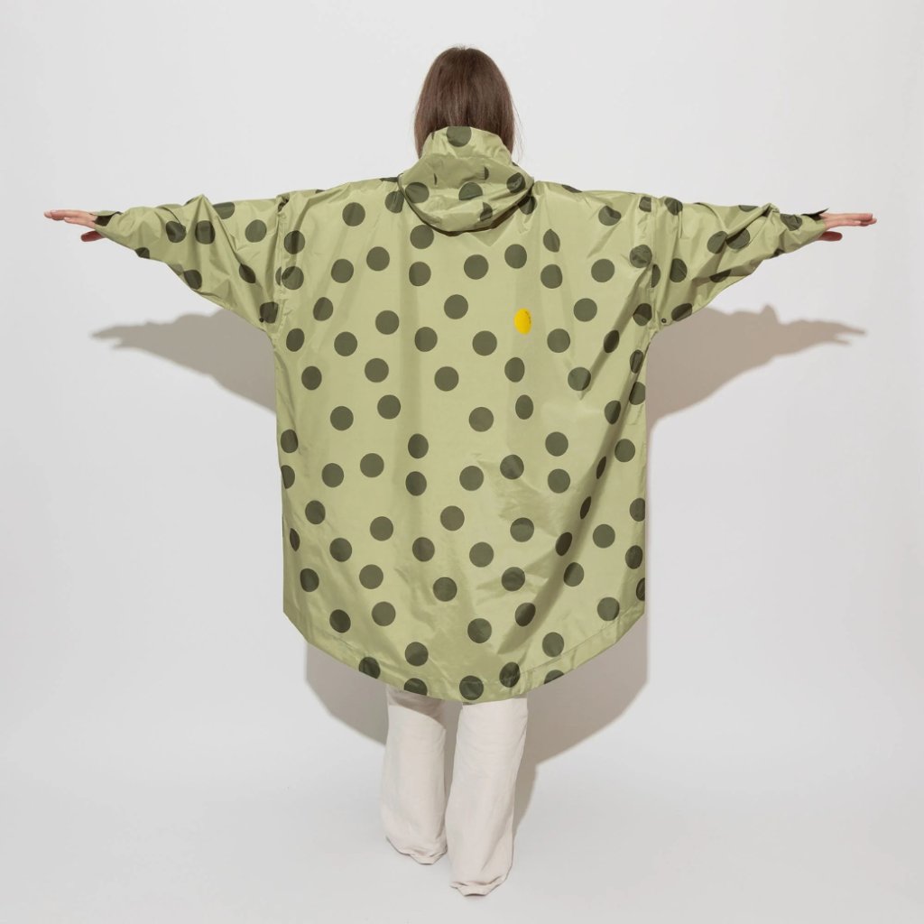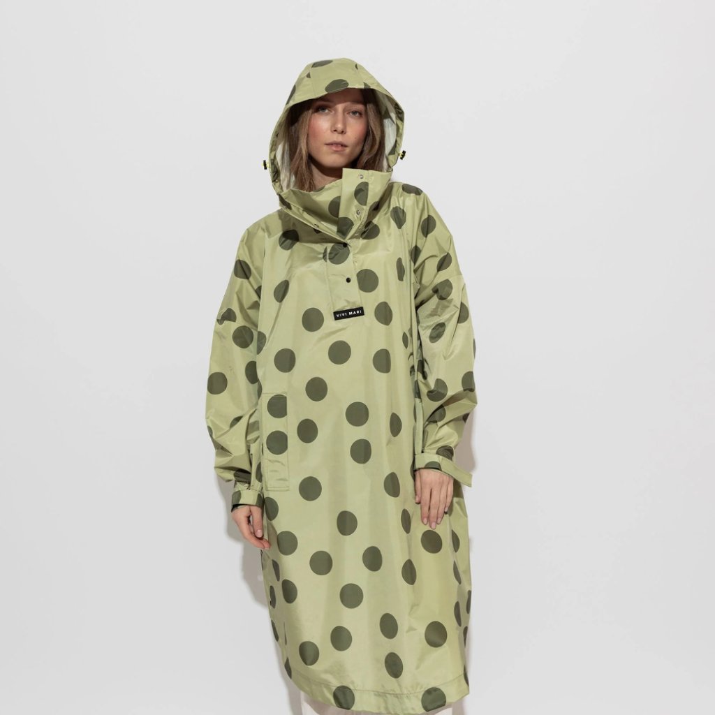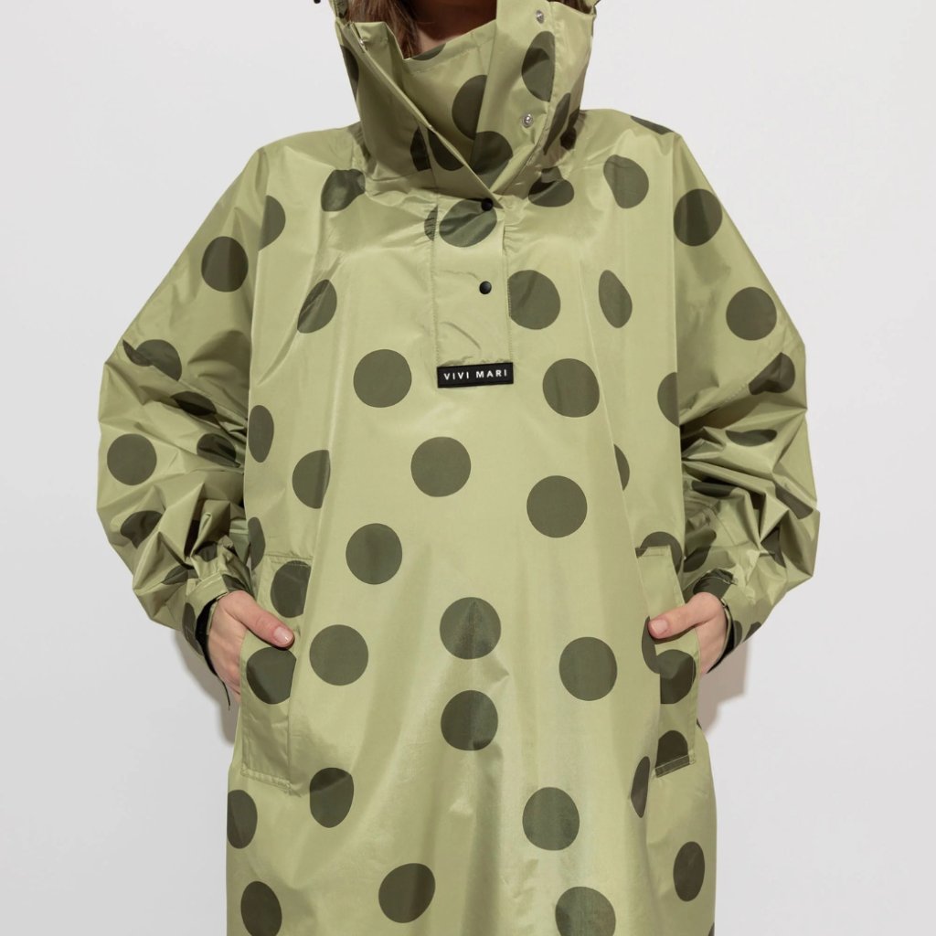 Originálny vzor VIVI MARI dots v jemnom odtieni pale olive/olive dodáva elegantný, no zároveň hravý vzhľad. Funkčné detaily ako nastaviteľná kapucňa s pruženkou, dažďová légová vložka s gombíkmi pri krku, manžety na suchý zips, bočné vrecká a priedušné otvory zaisťujú maximálny komfort. Zaoblený spodný lem s drukmi umožňuje voľný pohyb – ideálne na cyklistiku alebo aktívny pohyb v meste.