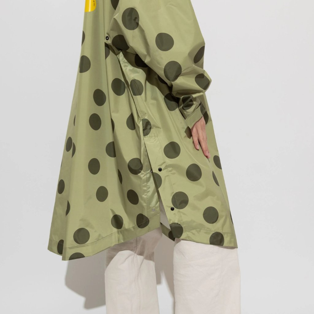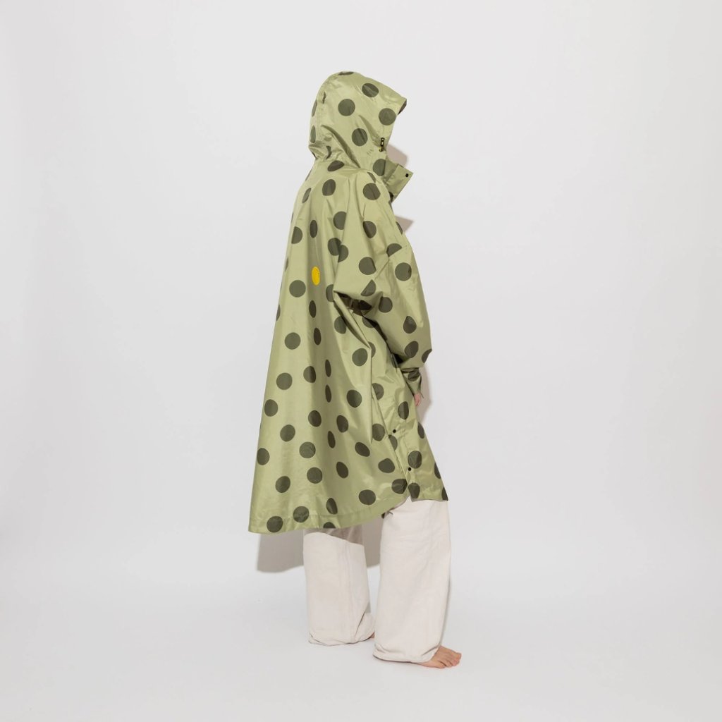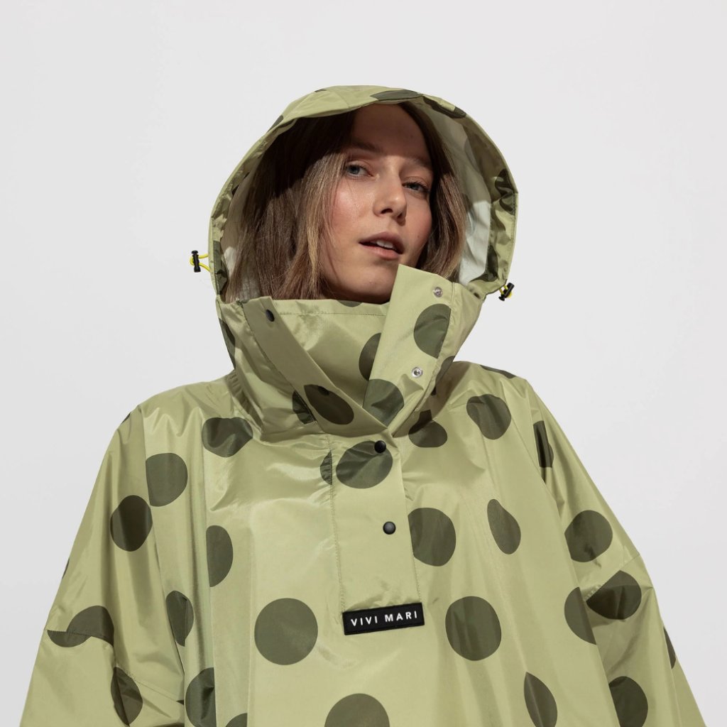 Originálny vzor VIVI MARI dots v jemnom odtieni pale olive/olive dodáva elegantný, no zároveň hravý vzhľad. Funkčné detaily ako nastaviteľná kapucňa s pruženkou, dažďová légová vložka s gombíkmi pri krku, manžety na suchý zips, bočné vrecká a priedušné otvory zaisťujú maximálny komfort. Zaoblený spodný lem s drukmi umožňuje voľný pohyb – ideálne na cyklistiku alebo aktívny pohyb v meste.