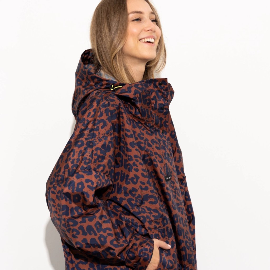 Originálny vzor VIVI MARI leopard v kombinácii námorníckej modrej a rezavej pridá outfitu výrazný prvok. Praktické detaily ako nastaviteľná kapucňa s pruženkou, dažďová vložka s légou a gombíkmi pri krku, manžety na suchý zips, bočné vrecká a priedušné otvory zaisťujú maximálnu funkčnosť. Zaoblený spodný lem s drukmi poskytuje voľnosť pohybu – ideálne na bicykel, do mesta aj na výlety.